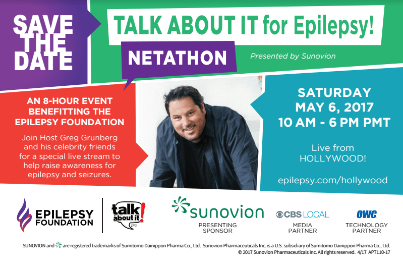 Mark your calendar for the upcoming online event this Saturday May 6, 10am-6pm pst (1-9pm est), the “TALK ABOUT IT for Epilepsy” Netathon, sponsored by Sunovion, to spread awareness and raise funds for epilepsy.