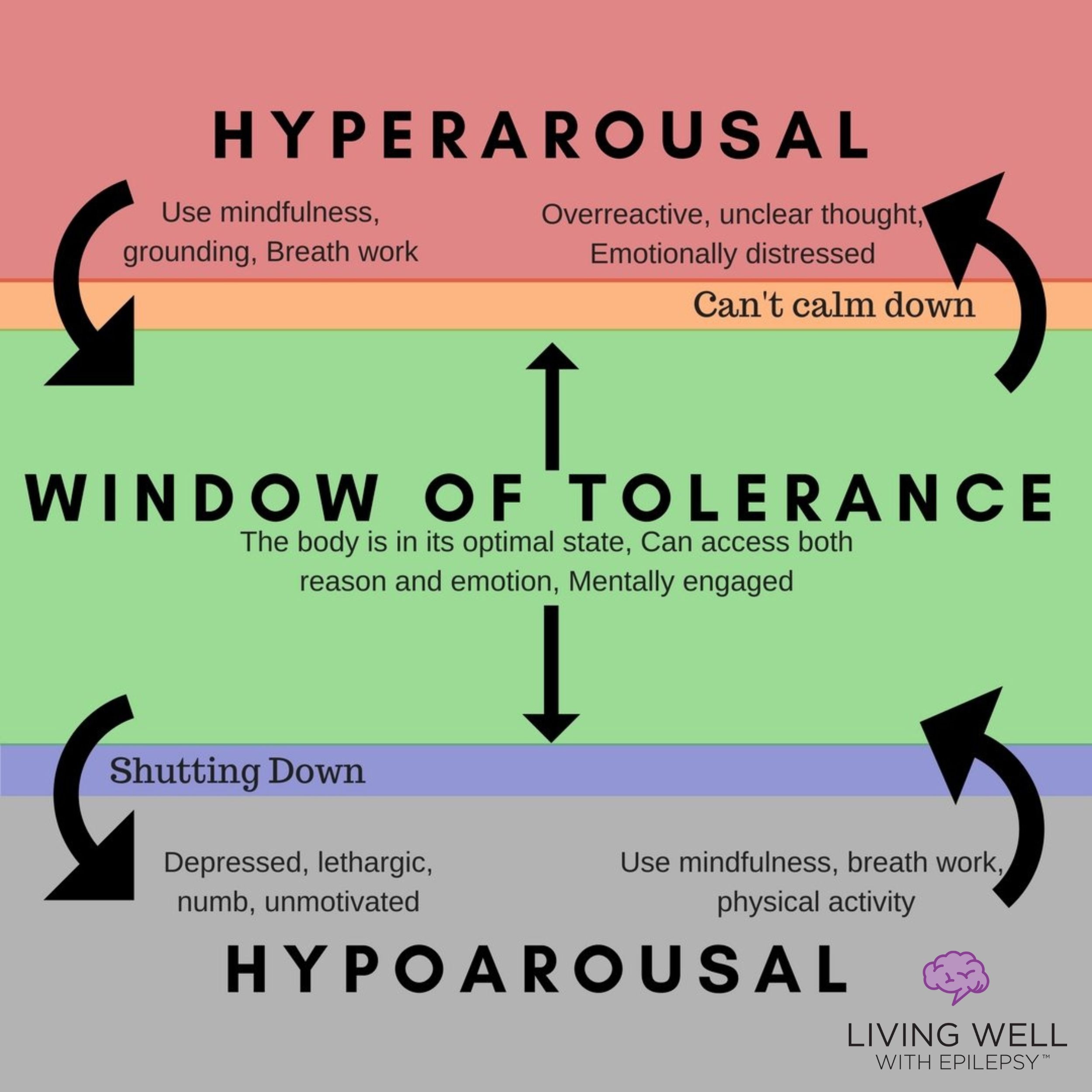 Anyone who has participated in epilepsy coaching with me has heard about the window of tolerance. But just in case this is new to you, I’ve included a diagram here.